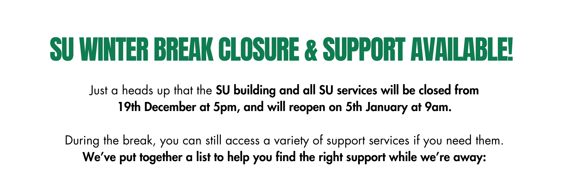 From the chance to win a FREE BUS PASS or RAILCARD, to the support and resources available over the festive break, see what’s happening as we wrap up the year at your Students’ Union!