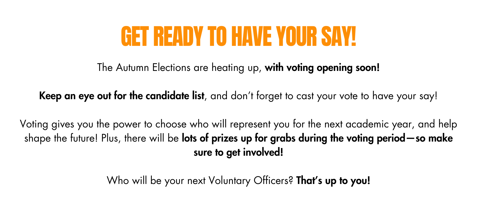 It’s almost time to have your say and vote for your new Voluntary Officers! And don’t forget to check out all the exciting events happening at your SU!
